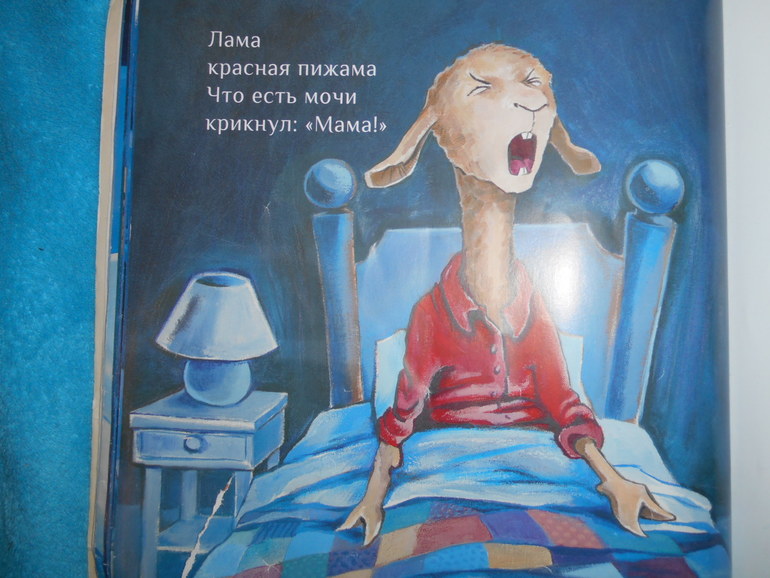 она во весь голос кричит «Мама!!!!!», так что кто спал, в ужасе просыпается, по-моему, соседи тоже. А мне очень нравится, как в книге описаны и проиллюстрированы чувства маленького ламы. Сначала он спокоен, потом ему одиноко, он взволнован, растревожен, начинает бояться, сердиться и злиться, очень напуган, пристыжен, а в конце, успокоенный любящей мамой, счастливо засыпает.
