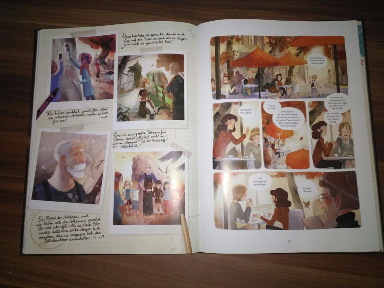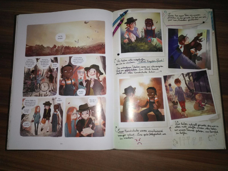 Да, как вы уже поняли, эта книжка не обычный комикс. Это такой очень гармоничный "графический роман" в коллажно-монтажной технике: дневниковае странички с пометками и рисунками чередуются со страницами "комиксов" , а те в свою очередь сменяются вырезками из газетных статей, фотографиями и письмами.