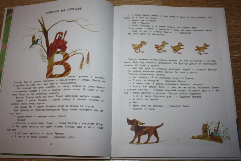 Вторая история про трактор, утёнок стыдил его за то, что он не умеет плавать, щенок за то, что не умеет лаять. А трактор вспахал поле и выросла пшеница.