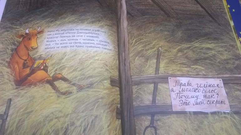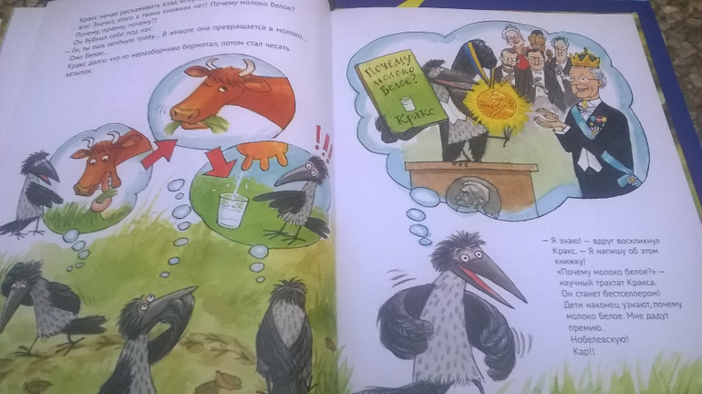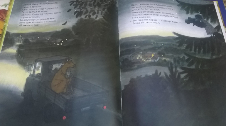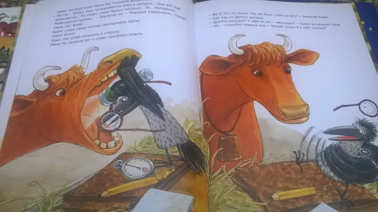 А вообще, перевод хороший. Мы заценили "здрасти-мордасти" и "сено-куро-мер". С юмором все в порядке, как и с переводом, читается легко. Простая история о корове, которая всегда хотела отличаться и пыталась научиться читать, да и о вороне, которая тоже была не против прославиться.
