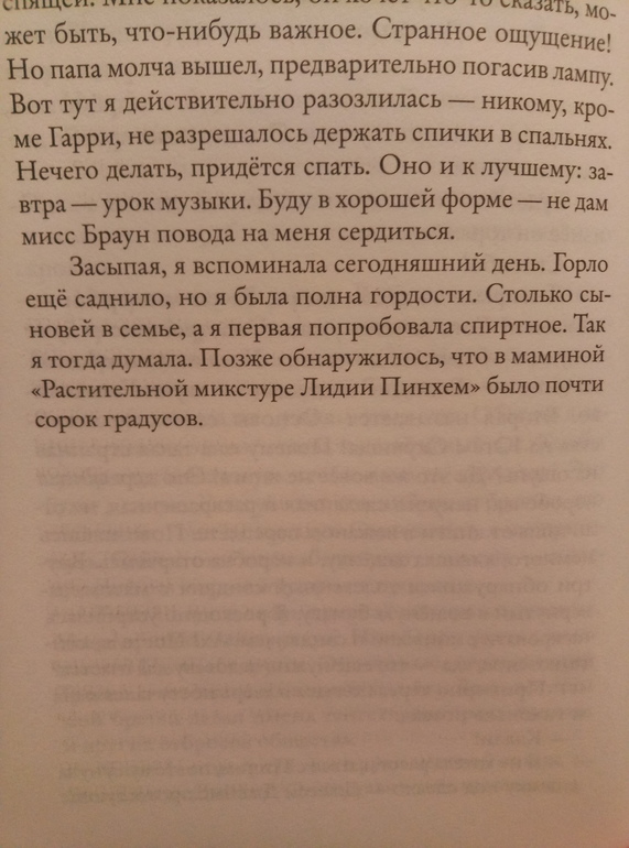 Много забавных моментов. Особенно радуют отношения главной героини с дедушкой: такие теплые и хорошие. А ещё он ей самогон давал. Своего брата Гарри Кэлпурния (я опять забыла её имя) любит. Причем до такой степени, что это становится больше похоже на собственничество. Вспомнить хотя бы одну из возлюбленных Гарри - Минерву - как девочка её невзлюбила! А все из-за того, что очень сильно любит брата. Точнее, ей нравится быть его любимицей. Собственница.