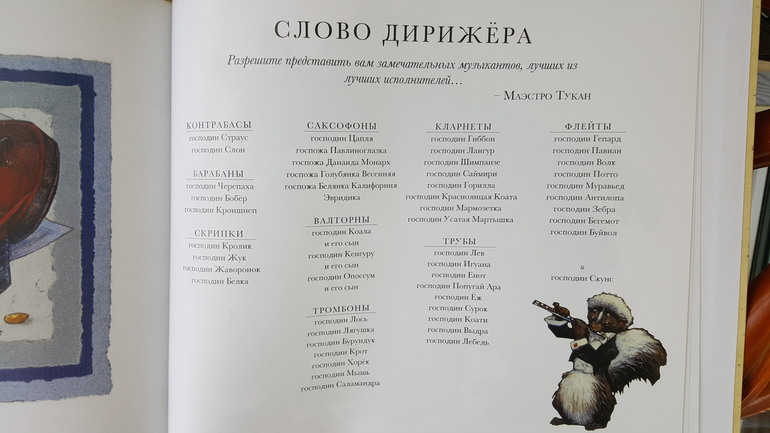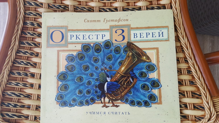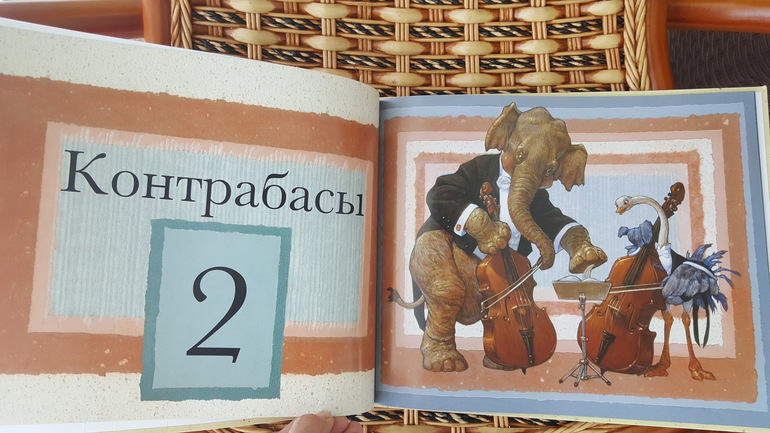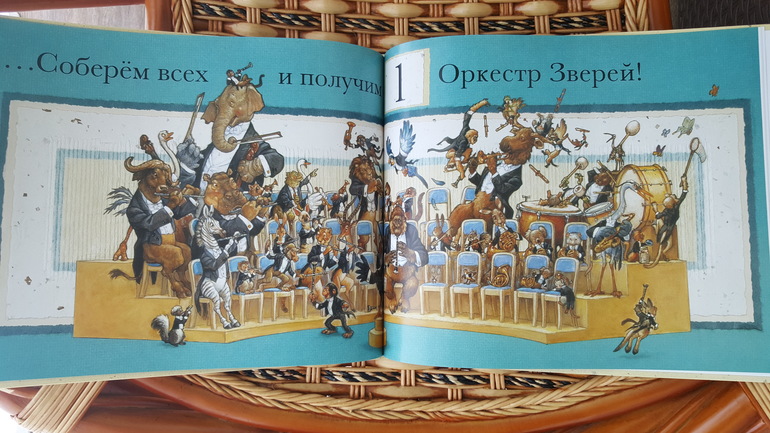 В книжке на каждом развороте изображено, как определенное количество животных играет на каком-либо инструменте. По ней можно изучать и счет, и названия музыкальных инструментов, и названия самих животных. Сейчас мы начали после просмотра определенного разворота включать музыку в исполнении изображенного инструмента.