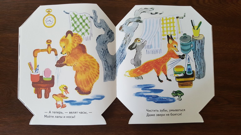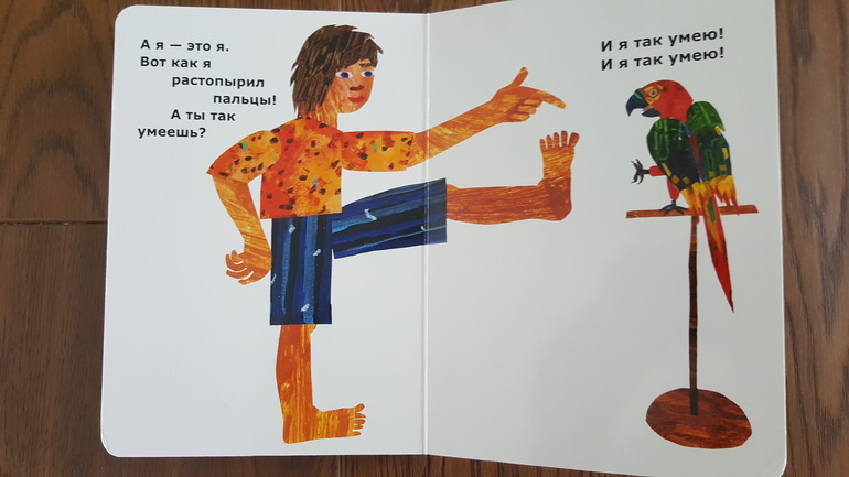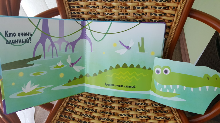 Также ни дня не обходимся без этой книжки. Побывала она у нас даже в ванне с водой, выжила и продолжает "мучить" всех членов семьи, заставляя нас брыкаться, изгибаться (уж не знаю, как крокодил изгибается), ну а позы с последнего и первого разворотов в нашем исполнении вообще неподражаемы.
