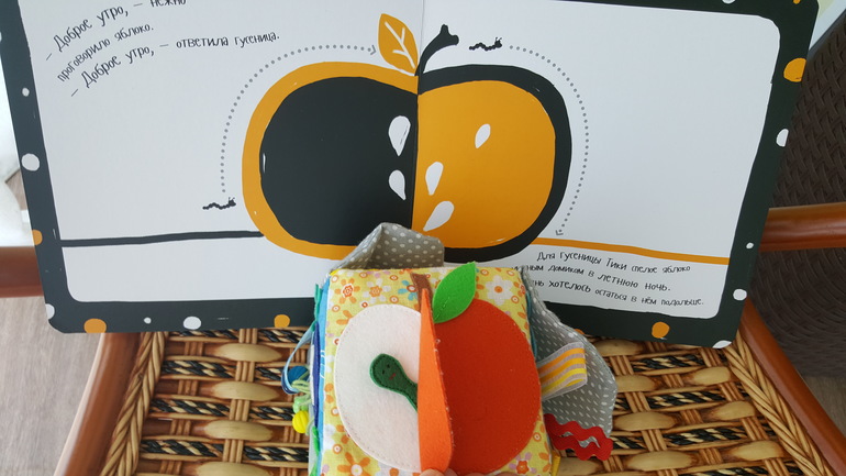Внимательно слушает текст, помогает в нужном месте найти нужного персонажа. О том, что гусеница находится внутри яблока поняла с помощью такого мягкого малышовского кубика:
