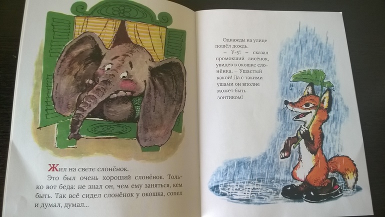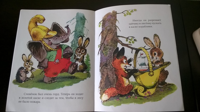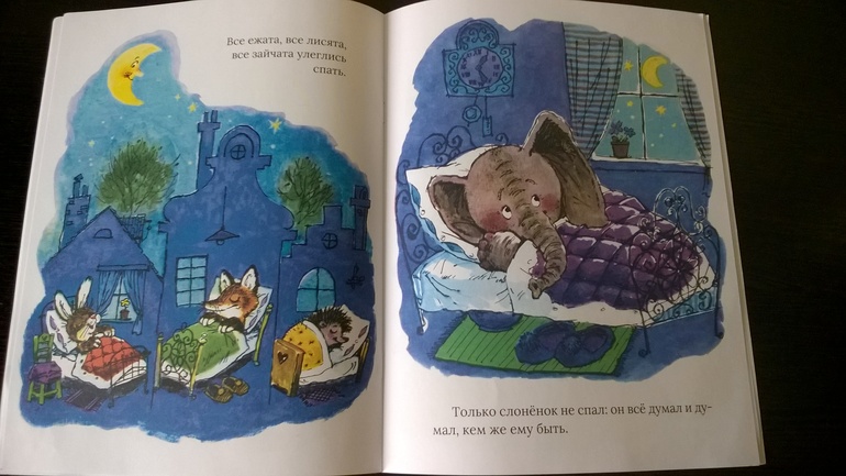 Это добрая, короткая история про слоненка, который искал свое призвание. Нам еще помогла эта книга спать отдельно в своей кроватке, я при чтении все время акцентировала внимания, что все зверята спят одни в своей кроватке.