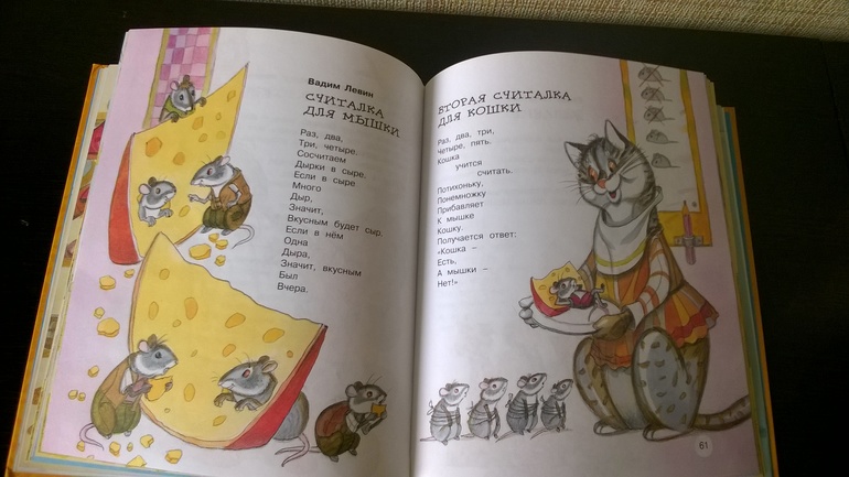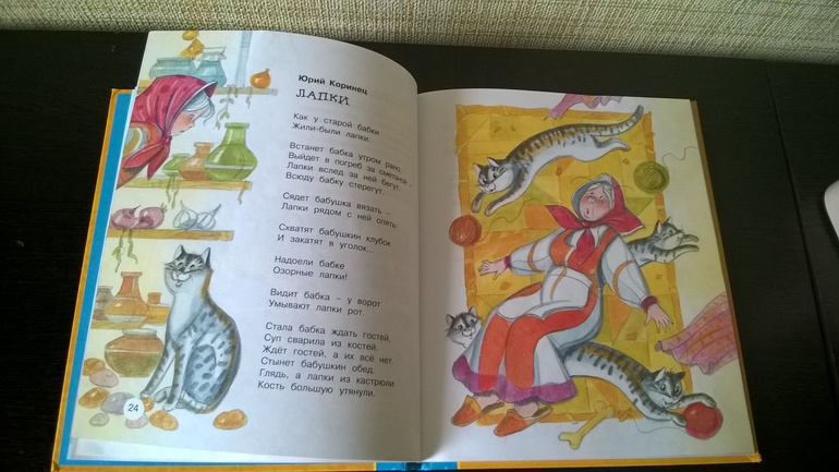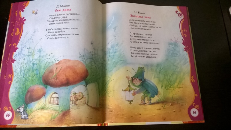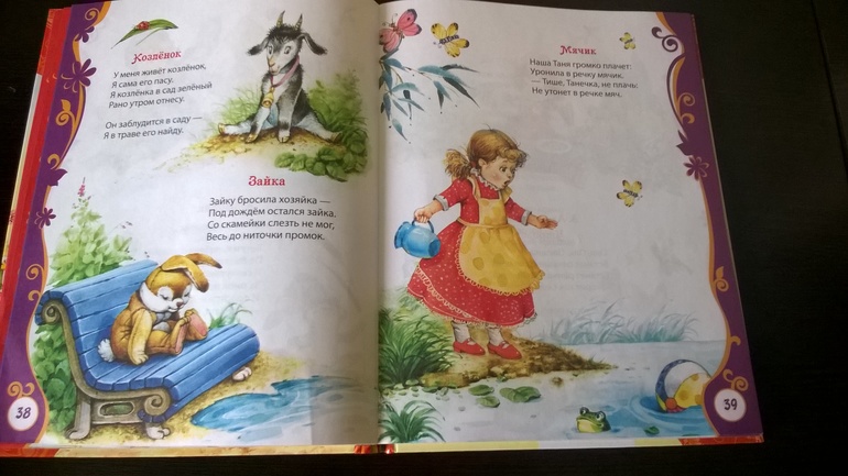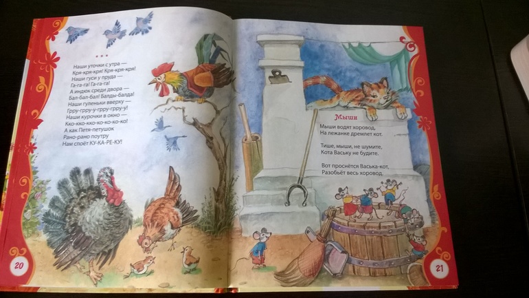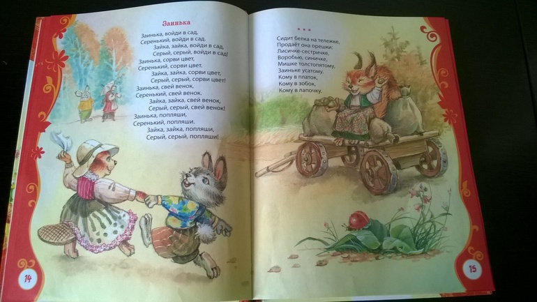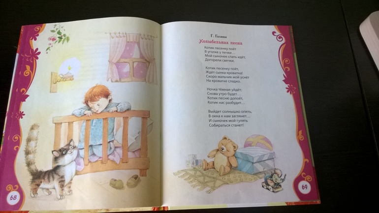 В книги содержатся потешки, стихи, колыбельные песенки и сказки малышам от года до трех лет. Сын книгу сразу полюбил, мы читаем с ним все кроме сказок, до них он видимо еще не дорос. Вот развороты некоторых страниц: