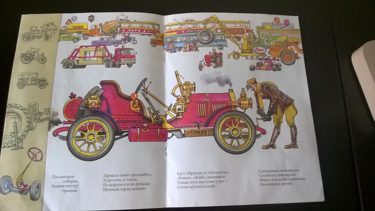 Вольт Суслов "Колеса" издательства "Речь", я покупала когда сыну было 1 год и 3 месяца, но тогда эта книга вообще его не заинтересовала. И вот только сейчас в 1 год 6 месяцев мой сын стал фанат машин и книгу он теперь обожает!
