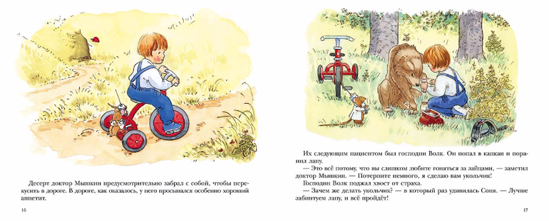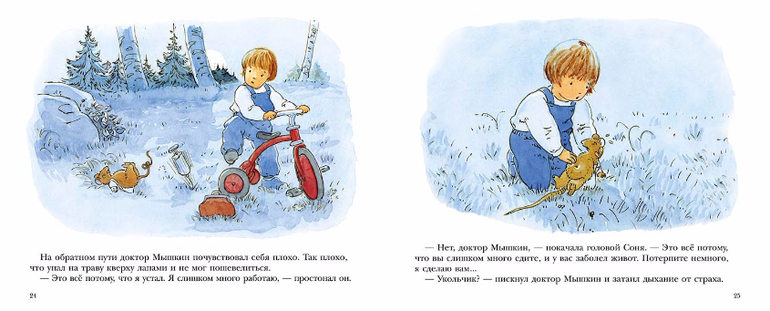 октор Мышкин был самым настоящим доктором, в этом не было никаких сомнений. Он носил белый халат, ездил на машине скорой помощи с мигалкой, и у него был докторский чемоданчик, где лежали разные лекарства, пластырь, бинт, пинцет, а главное - шприц. Доктор Мышкин очень любил делать уколы. По правде сказать, других способов лечения он не признавал. Вот только при виде шприца с острой иглой все больные начинали мелко дрожать, втягивать головы и поджимать хвосты. Интересно, почему? Хорошо, что у доктора Мышкина появилась помощница - медсестра Соня. Она умеет найти подход к пациентам и знает, как вылечить их без всяких уколов. Ей удалось вылечить даже самого доктора Мышкина, когда тому стало плохо.