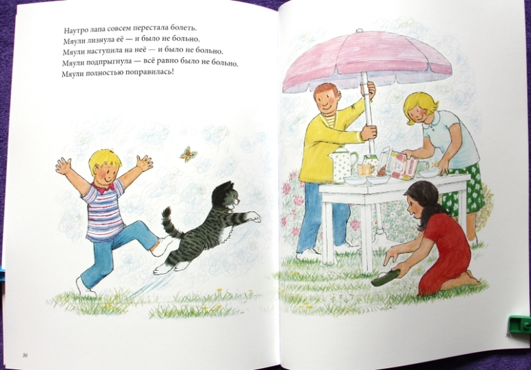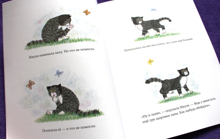 Конечно, я поздновато купила Мяули, сын давно читает, но ему понравилась история - теперь он усиленно пытается объяснить брату, что кису не надо обижать. А вот младшему книга очень понравилась - нарисованных кисок он любит и гладит их (в отличии от настоящей).