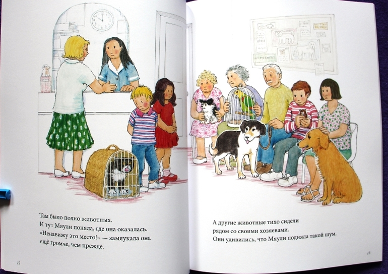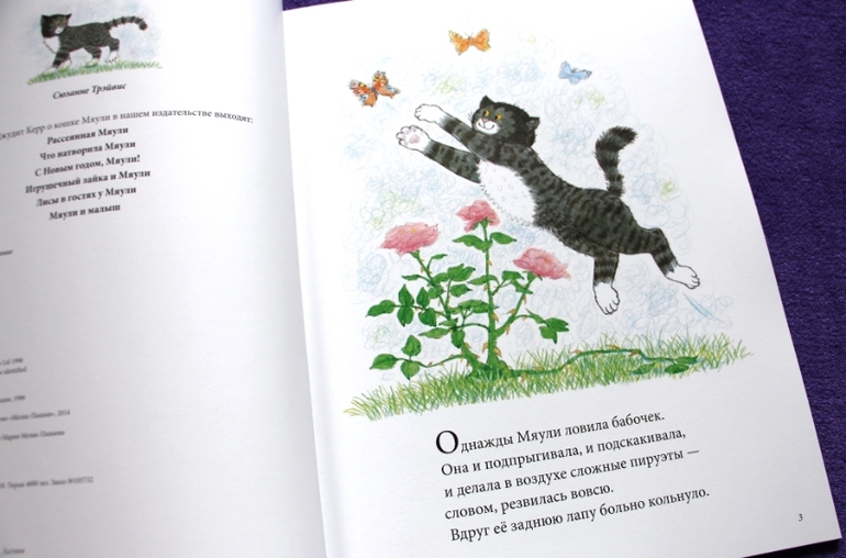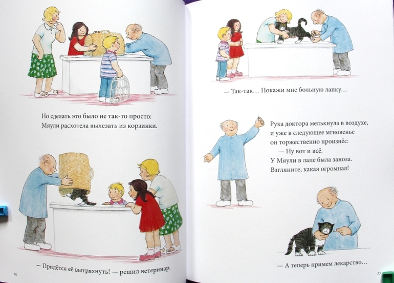 У меня возникло ощущение, что Мяули именно с целью заботы о животных и писалась (ведь зарубежные авторы часто получают заказы на определенную тематику). А еще Мяули писалась как книга для первого чтения - причем для самого первого. Предложения в ней очень простые, текста мало, шрифт крупный. Иллюстрации очень милые, их много, но за счет того, что все они на белом фоне, страницы не пестрят яркостью и ребенка не отвлекают (в одной передаче рассказывали как это важно для обучения чтению).