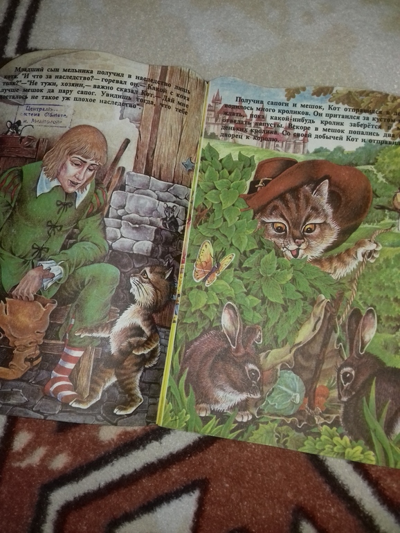 Кот в сапогах( не очень удачная, местами из-за тёмных иллюстраций слов не видно, хотя сама сказка в более полном варианте, чем наша домашняя)