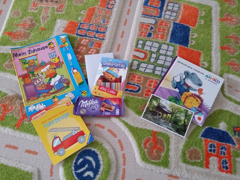 У Ильи глаза разбежались, за что хвататься. Мико он знает и узнал, то "почитай", тематика-то как раз праздничная, актуальная)), то "пожяня мащщииииина бррр", то "паровозик! кися! наклейки!"
