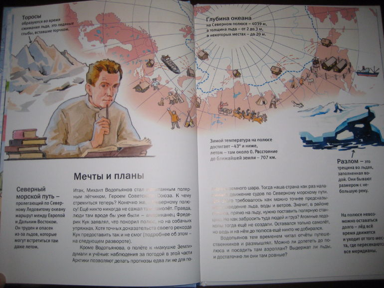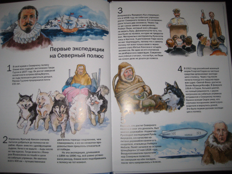 Во-первых, не очень большой объем текста, однако, что удивительно, даже с подробностями и тонкостями, например, довольно обстоятельно рассказывается об открытии Северного полюса. До сих пор достоверно так и не известно, кто же сделал это первым. Фредерик Кук или Роберт Пири? Во всяком случае первым, кто достиг Северного полюса и смог это доказать, был экипаж дирижабля "Норвегия" под руководством Руаля Амундсена. "Воздухоплаватели пролетели над Северным полюсом, не совершая на нем посадки, после чего направились к Аляске".
