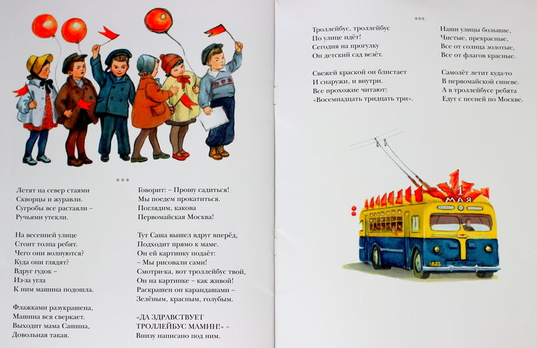 Мамин троллейбус- история о троллейбусе, водителем которого служит мама мальчика Саши. Конечно, история пропитана советским духом, но от этого она такая спокойная и приятная, всё будет хорошо!) мама водит троллейбус, мальчик наблюдает с детишками из сада за маминой машиной, утром мама на работу, Саша сам на остановку в мороз и снегопад, мама его 5 остановок на троллейбусе до садика везет. Но однажды приехал другой троллейбус с другим водителем и кондуктор рассказывает Саше, как мамина машина попала в аварию. Затем повествуют, как машину чинят, красят и всё снова хорошо, а на 1 мая мама на украшенном флажками троллейбусе катает детишек по столице. Ну вот просто советский дух и всё будет хорошо!)) но книга приятная, интересная, и сюжет (авария- ремонт), и показана канава, как машину моют- мальчишкам моим уж очень интересно!