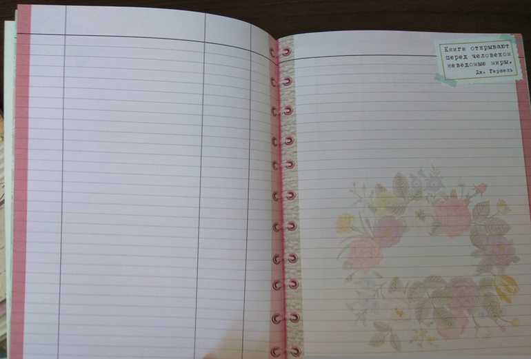 Страницы уже разлинованы в таблицу, очень удобно заполнять дату, название, количество страниц на левой части листа, а правая остается для содержания, впечатлений, рисунков и прочего, что душа пожелает. Лишь бы книга интересная была.