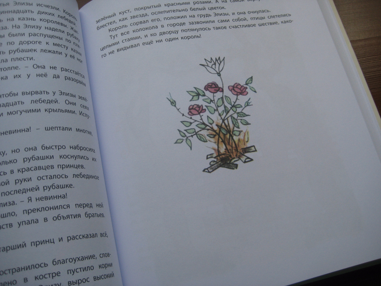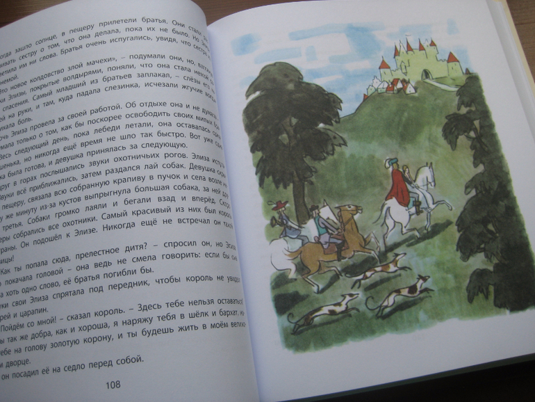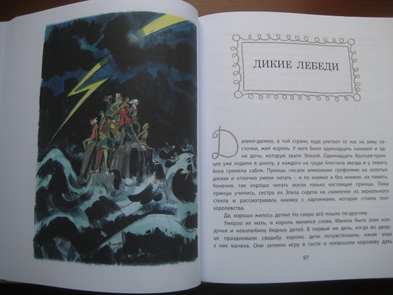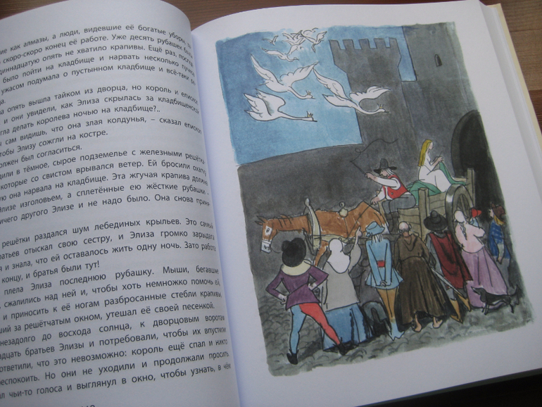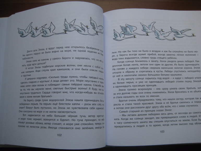 "Раз под вечер, когда солнышко еще сияло на небе, из-за леса поднялась целая стая чудных больших птиц. Таких красивых птиц утенок никогда еще не видал - все они были белые как снег, с длинными, гибкими шеями.