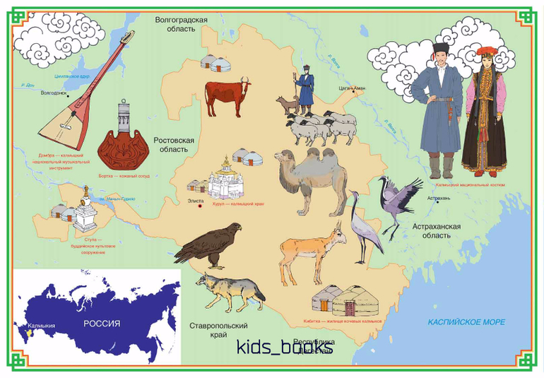 "На самом юго-востоке нашей страны раскинулись степи Калмыкии. Далеко просматриваются пастбища. Солнце палит, дует горячий ветер и тяжело найти тень, чтобы спрятаться, на многие километры - ни одного деревца. Калмыкия - самая «безлесая» территория нашей страны, полупустыня. Засухи здесь обычное дело. Реки Калмыкии небольшие и летом часто пересыхают. Лишь в одном узком месте Калмыкию пресекает могучая Волга. А с другого края её земли омывает Каспийское