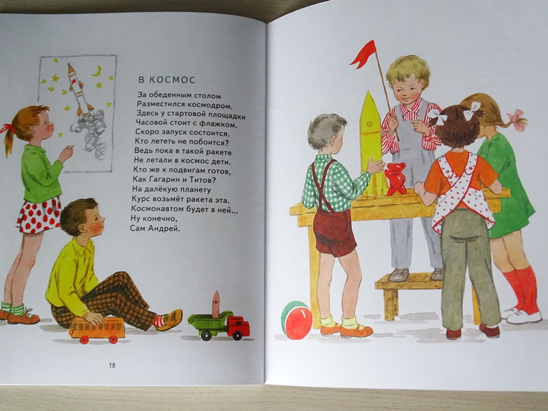 На каждом развороте есть детские рисунки к стихотворениям.Ещё считаю одним из плюсов крупный текст.