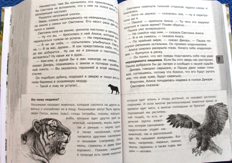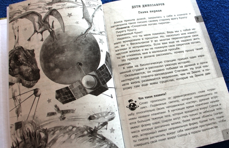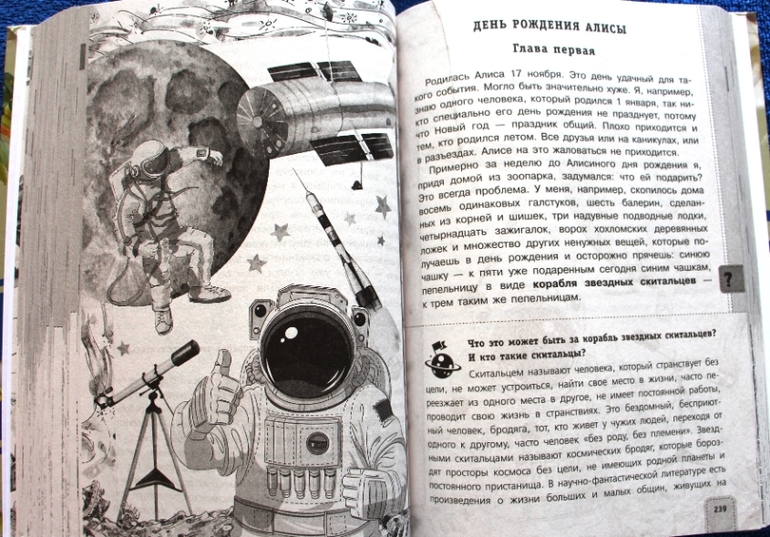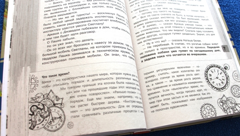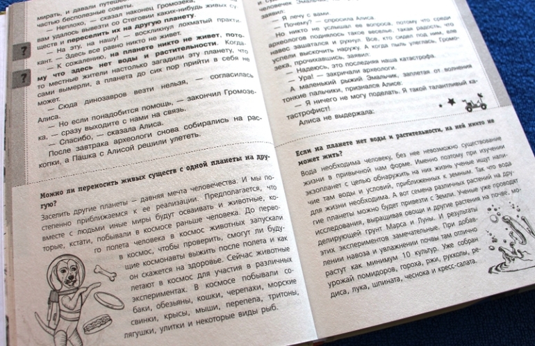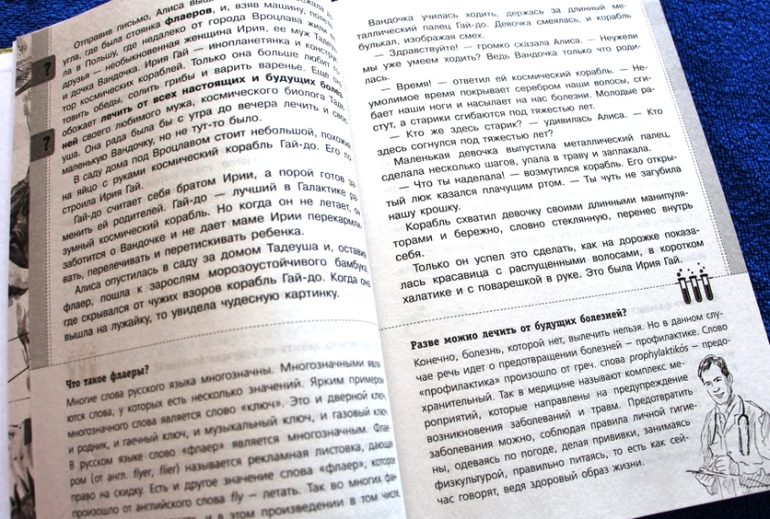 Текст затягивает, потому что это Булычев, а еще потому, что примерно треть листа посвящена пояснению непонятных слов, явлений, научных открытий, даже пословиц. Например: что такое вакуум, зачем растениям колючки, бывает ли такой город Фальмагуса или его выдумал автор.