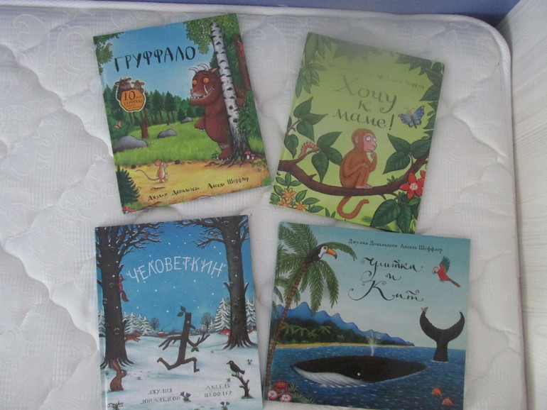 Дж. Дональдсон - с самого дочкиного раннего детства о ней мечтаю, но добралась только сейчас. Хочу к маме куплена сыну, но читали пока с Лидой, понравилось! Груффало понравился очень, и мультик смотрели. Про дочурку хочу почитать с ноута. Улитка и кит тоже хороша, но Лиде меньше понравилось, чем Груффало. Человеткина пока не читали. Присоединяюсь ко всем одам,спетым переводу Бородицкой. Хочу прочитать на-английском, даже интересно будет сравнить.Уверена что перевод лучше оригинала(( потому что лучше и не скажешь!