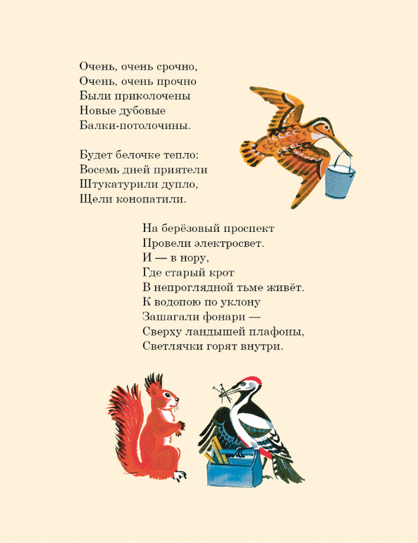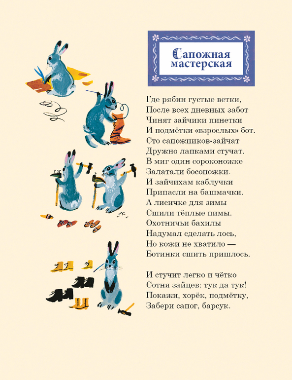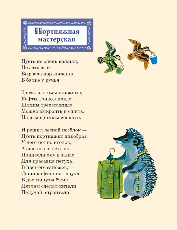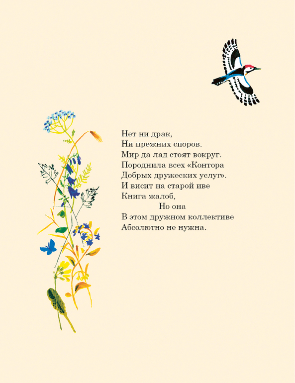 Плохо жилось лесным обитателям без ремонтных мастерских. Чтобы сшить зайке комбинезон, а сороконожке босоножки приходилось ходить за сорок вёрст. Решили звери открыть «Контору добрых дружеских услуг». Сотни умелых рук взялись за работу. Зайчики чинят сапоги и пинетки в сапожной мастерской. Шагают по посёлку пять бригад строителей. Трясогузки и бобры стали малярами, жуки с кротами землекопами, комары конопатчиками, муравьи штукатурами, дятлы плотниками. Появилась в лесу столярная и портняжная мастерские, и даже кузница. Всех зверей и птиц сплотила «Контора добрых дружеских услуг». Не стало прежних драк и споров, в лесу воцарились мир и дружба.