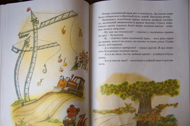 Еще одна любимая сказка. О том, как два крана решили отдохнуть на природе. Только кто-то все время просил помочь - то лягушки, то белочка.. И один кран отказывал, потому что он же отдыхает, а другой с улыбкой помогал. В итоге оказалось, что то кран, который помогал и отдохнул лучше. А еще он узнал, что любит цветы)