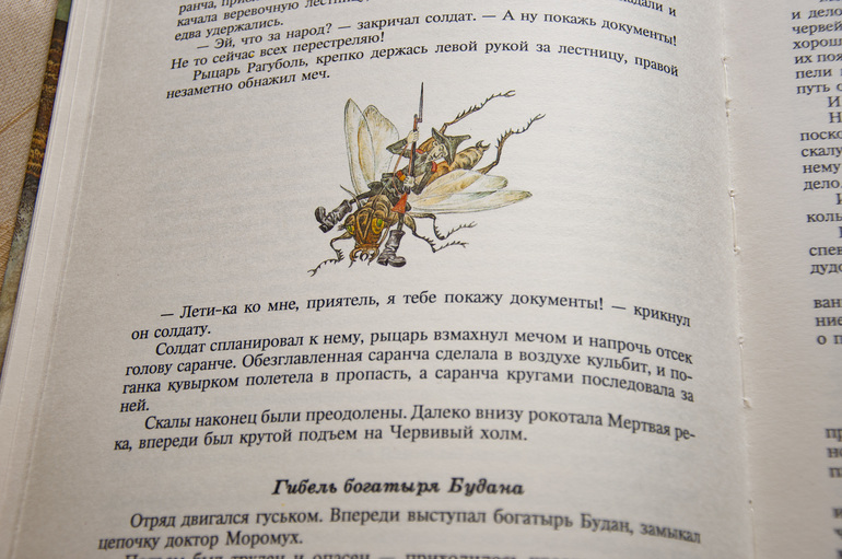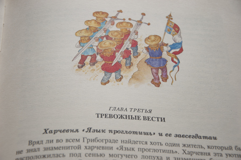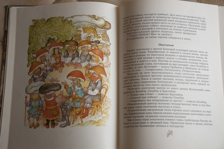 Наверное, самая оптимальная первая книга о войне. Пусть о войне грибов, пусть сказочная, но чего там только нет - и полководцы, и армии, и заседания перед боем, авиация из саранчи, заставы, коварство, изобретения военного оружия в академии поганок, есть погибшие хорошие герои. Но все это намешано на волшебстве - колдуньи, магистры, волшебный сундучок ... Попутно в книге интересна еще одна вещь, многие грибы изображены и в образе сказочном и в реальном виде. Так что и грибы изучить можно. В общем очень и очень любопытная книжка. Но текста много. Сначала мне продираться сквозь повествование было трудновато. Но потом, когда сюжет стал разворачиваться, стало увлекательно.