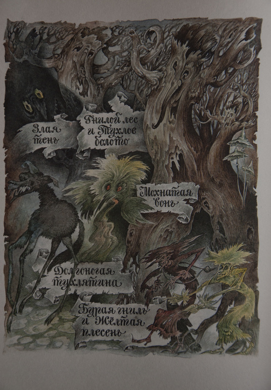 Эта прям сами страхи детские и не только, на мой взгляд. Мохнатая вонь, Злая тень, Долгоногая тухлятина (это ж надо было такое придумать и нарисовать), Бурая гниль, Желтая плесень.. Но есть и преимущество. Во-первых они на бумаге, а не в мыслях - на них можно глянуть, побояться, как пишут психологи - страхи, что не в голове уже не имеет такой силы. Потом далее со всеми ними еще разделаются. Добро победит. Но рисунок меня впечатлил. Кажется, и мне даже легче стало) Может своим страхам в лицо глянула)