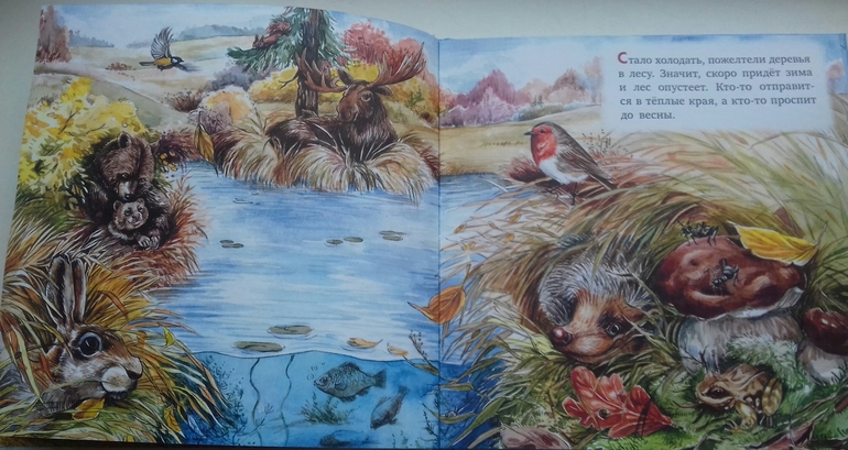 И действительно, здесь в небольшом по объему тексте ребенка знакомят с тем, что происходит зимой с перелетными и зимующими птицами, с рыбами, насекомыми, земноводными и зверями(теми, кто ложится в спячку и теми, кто и зимой ведет активный образ жизни).