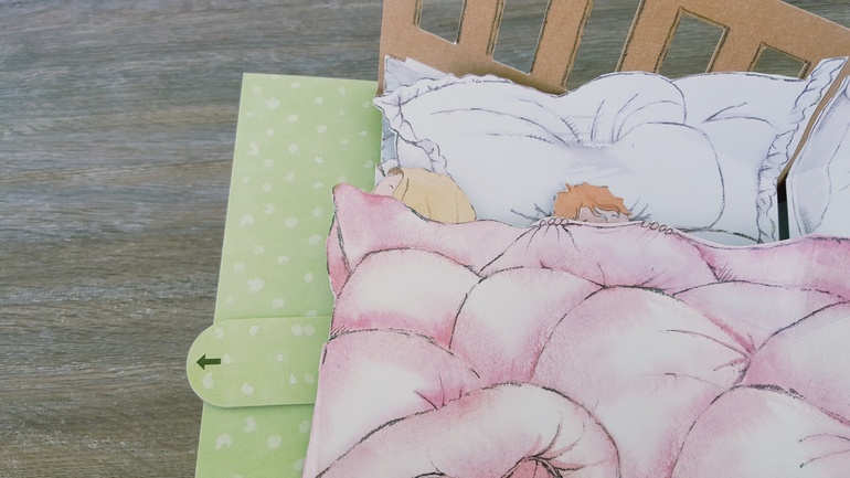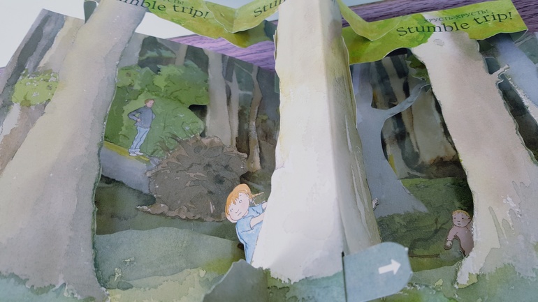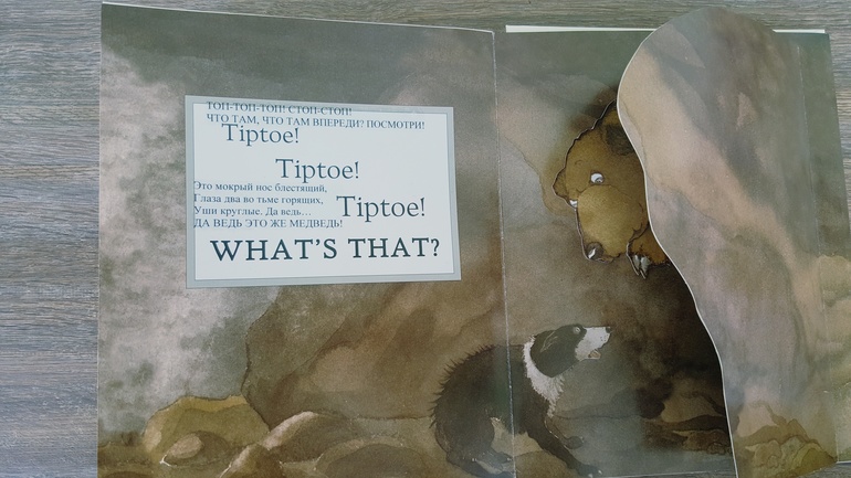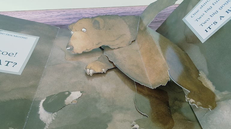 Здесь выдвигается стрелочка справа, герои приходят в движение, этим самым создается хруст (все звуки создаются движением самой бумаги, не батарейками):