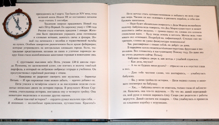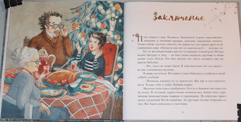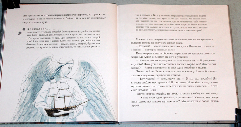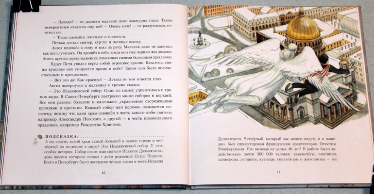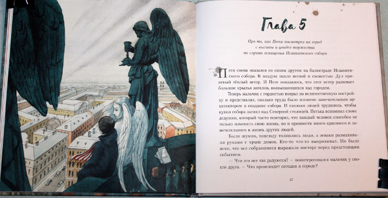 Художественная часть в книге не замысловатая. Петя, ученик 4-го класса, плохо знал историю своего города (Санкт-Петербурга), за что и получил несколько двоек. Накануне Рождества бабушка дарит Пете статуэтку Ангела. Ночью Ангел оживает, будит Петю и они летят на Исаакиевский собор. Там Петя встречается сначала с Петром Первым, потом с архитектором собора, далее они с Ангелом наблюдают за открытием собора и возвращаются домой. А дома Рождество и вся семья за праздничном столом, Петя предлагает всем отправиться в Исаакиевский собор.