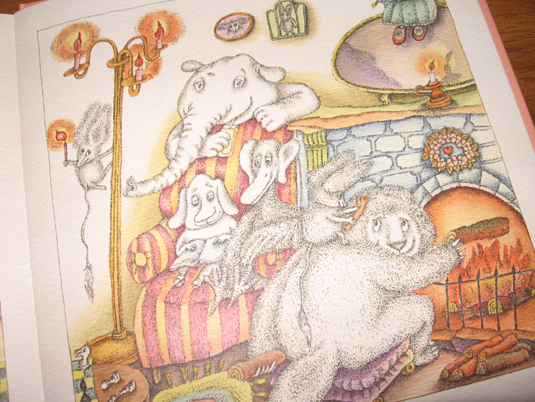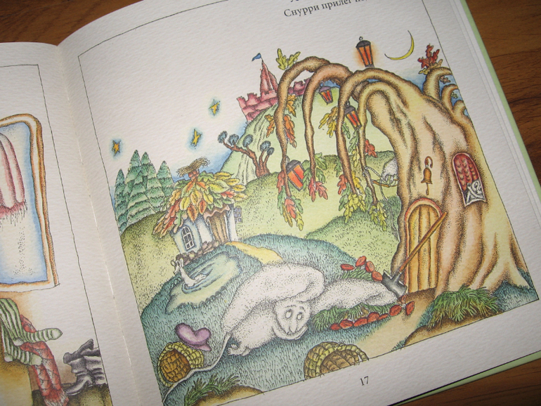 Текста, как и в первых двух, совсем мало. В этой книге, правда, сюжета, как такового нет, но рисунки все так же шедевральны. Поскольку эта книга знакомит читателя со всеми нарисованными чудиками, то каждый разворот - это совершенно новая атмосфера. То пруд, то горы, то большой дуб, то просто уютная комната. Но все это наполнено сказочной живностью, которую, повторюсь, мы очень любим рассматривать