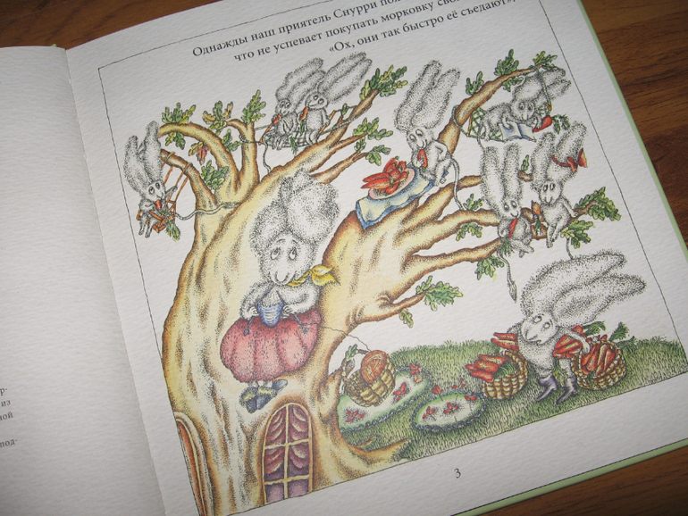 "Тайна огорода Снурри" тоже не менее забавна в плане иллюстраций. Если со Снурри и его семьей все у нас однозначно. Вердикт детей - это кролики с пушистыми ушками. То другие обитатели вызывают сомнения. Например, кто такой Дарк? Существо со свиной мордой и ушами, но живущее в норе под землей.