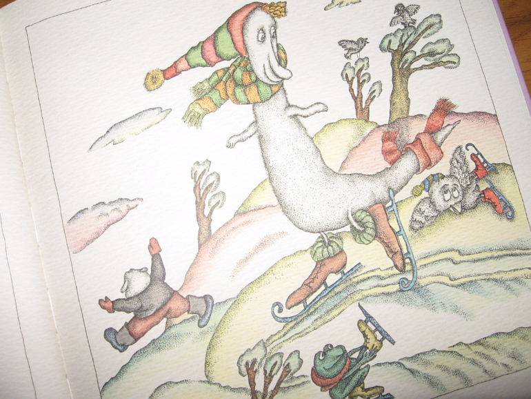 Утка с человеческими ушами тоже популярна у нас. Она скромненько стоит в сторонке на странице тринадцать, обмотав длинную шею красным шарфом и облизывая сосульку.