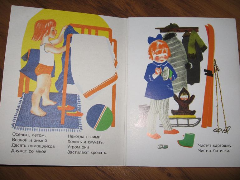 Хотя, в отличие от предыдущей книги, в этой стихов целых четыре штуки: "Не мешайте мне трудиться", "Приходите, поглядите", "Научу обуваться и братца", "Щёголь". Соответственно и текста на каждой страничке больше, чем 2-4 строчки