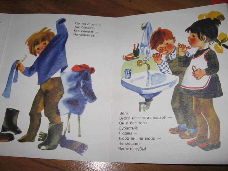В этой книге стихи не больше, по шесть-восемь строчек всего. Как и в книге Бориса Заходера, в этой книге высмеиваются плохие привычки. Я уже и говорила, что на моих детей это действует не особо, но периодически буду предлагать для чтения. Мало ли...