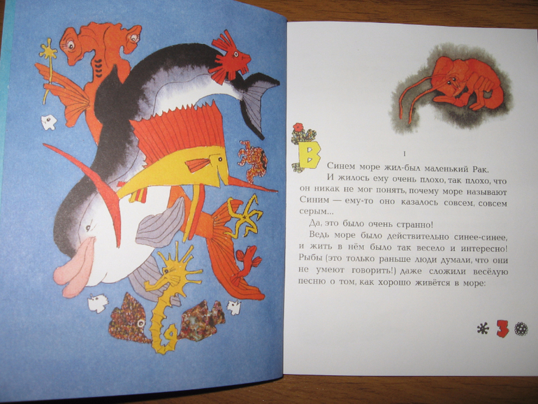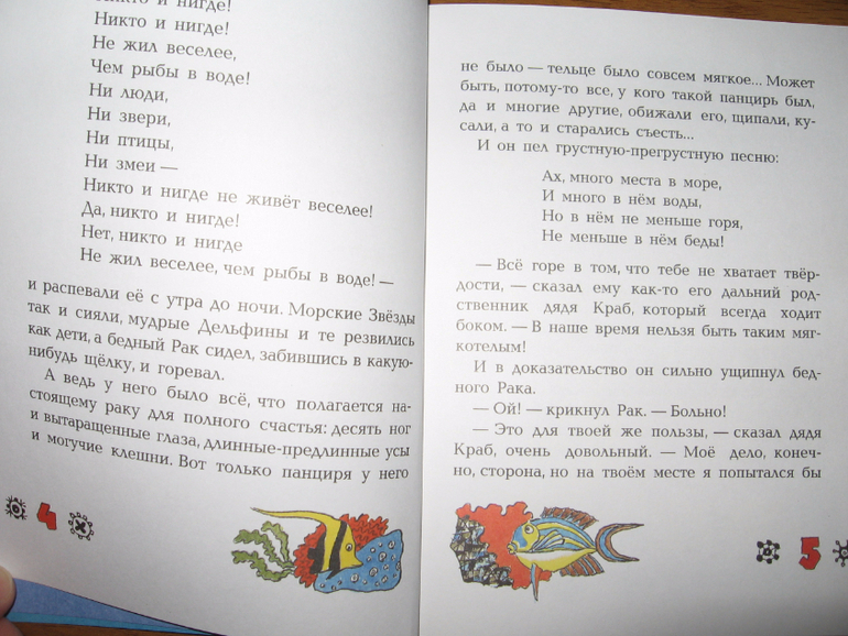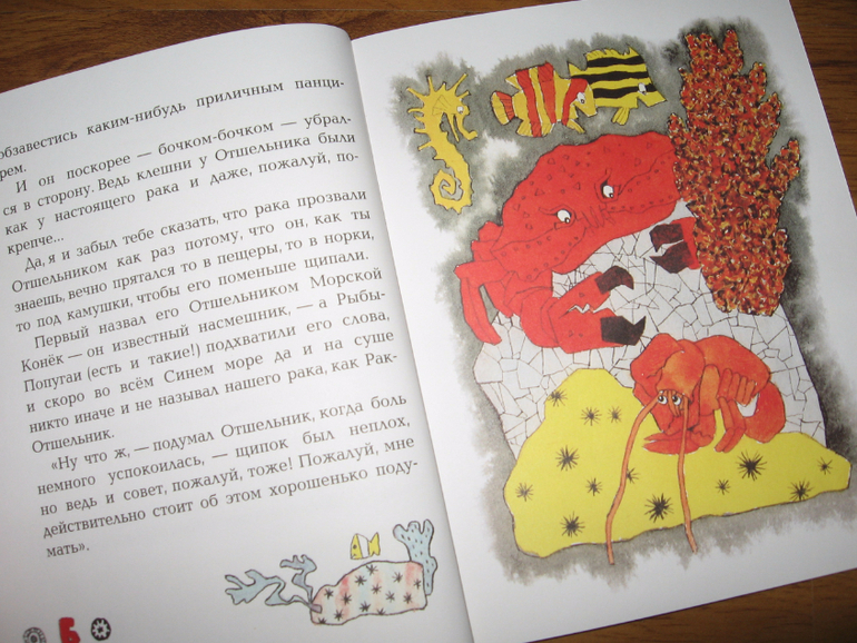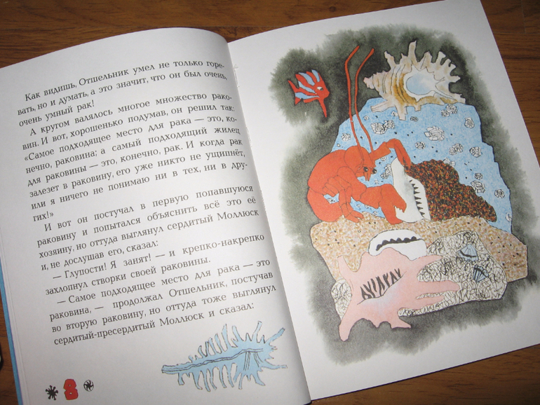 Читала я эту книгу детям перед сном, притащила ее для чтения Алиса. Думаю понятно, что выбор на нее пал из-за яркой обложки)) А вот дослушать дочь ее не смогла до конца, уснула на середине примерно. Зато Егор прослушал книгу полностью. Очаровательная сказка о дружбе и о том, что порой самое важное и долго разыскиваемое находится у нас под самым носом, только клещню руку протяни. Но чаще всего, чтобы это понять, нужно три пары башмаков железных износить, три посоха железных истереть, да три хлеба железных сгрызть. Хоть и банально, но ведь именно это все и придает жизни смысл. делает ее интересной. Эта книга больше всего удовольствия доставила мне, а дети... А дети больше книге не возвращались пока, хотя она находится в непосредственном их доступе. Даже иллюстрации не рассмотрели толком, может еще дорастут.