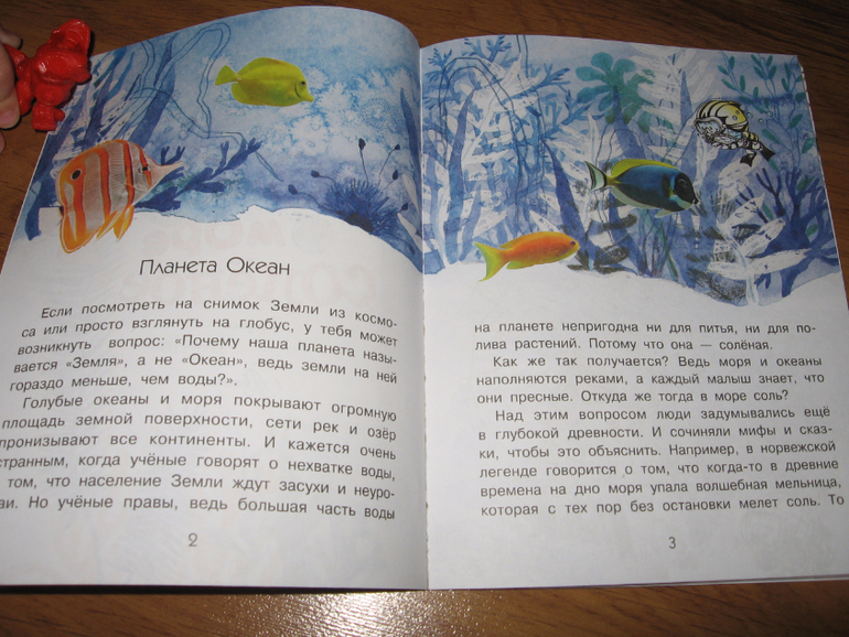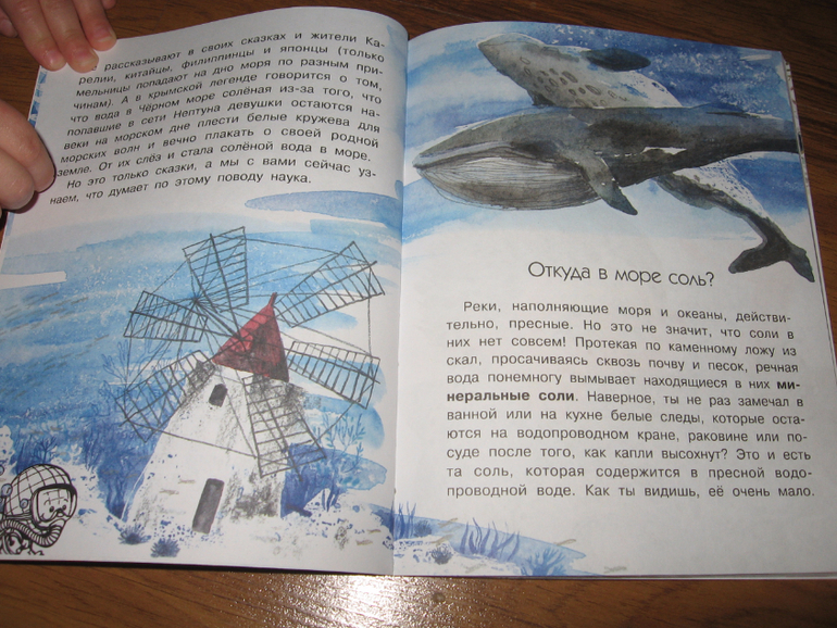 Книгу "Почему море соленое?" мы читали несколько раз, т.к. и тема для Егора оказалась интересной, и опыты повторяли, поэтому перечитывали (иногда отдельные главы). Начинается книга с двух легенд. норвежской легенды, в которой говорится о том, что когда-то в древние времена на дно моря упала волшебная мельница, которая с тех пор без остановки мелет соль. Вторая легенда крымская. В ней соленость моря объясняется следующим образом: в сети Нептуна порой попадают молодые девушки, которые вынуждены навеки остаться на морском дне, чтобы плести белые кружева для морских волн. Они веками оплакивают утраченную родную землю, вот вода и стала соленой от их слез.