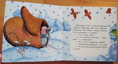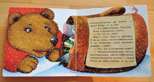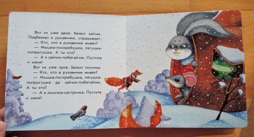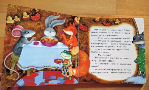 Маленькие картонки с короткими вариантами всем известных сказок. Очень нравятся спокойные цвета. Покажу внутренности на примере одной из них: