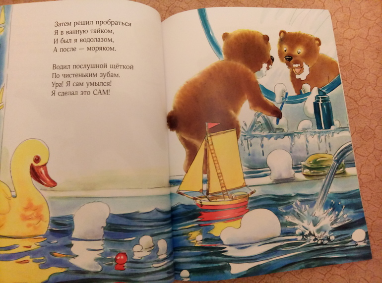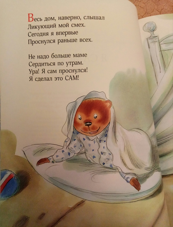 У нас очень рано появилось это Я, чуть что, Я, одеваться Я, обуваться Я, падать тоже Я) Поэтому книга нам была необходима) и сразу добавилось Я САМ) очень ритмичный стишок, как марш прям читается, и забавный,я когда первый раз читала, улыбалась до ушей) и воспитательный элемент есть, к самостоятельности приучает, и одеться, и обуться, и поесть себе приготовить) И для мамы пример спокойного принятия ребенка) посмотрите, в каком виде это чудо к маме вышло)