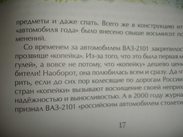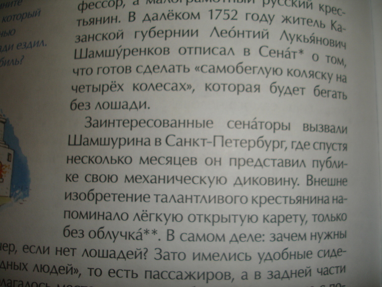 В книге упоминаются: самобеглые коляски, автомобиль Яковлева и Фрезе, "Руссо-Балт", "АМО-Ф15", "ГАЗ-АА" и "ГАЗ-ММ", "Победа", "ГАЗ-21", "Копейка", "Чайка","УАЗ-469", "ЛиАЗ-677". К содержанию у меня никаких претензий - написано с нежностью к отечественному автопрому. А вот редакторы могли бы быть внимательней. Вот здесь создателя безлошадного экипажа называют сначала Шамшуренковым, потом Шамшурин.