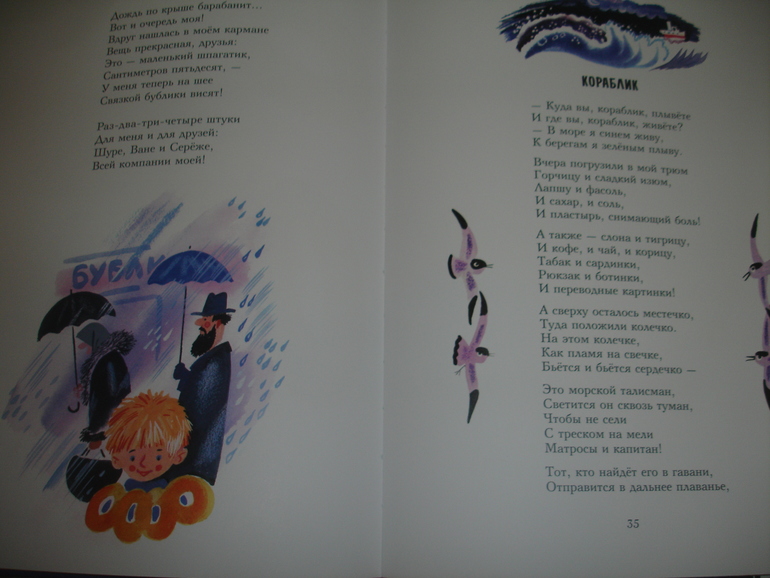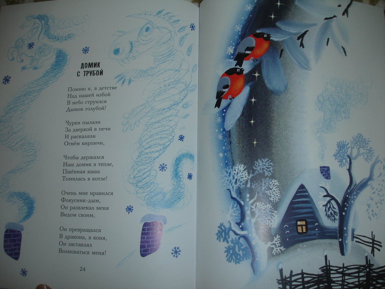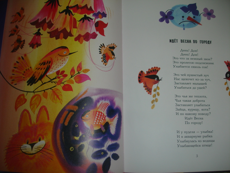 Про содержание. Сане немного рановато, есть длинные стихи, например, про морские талисманы, которые ещё и непонятны. Очень понравилась Сане Весна Мартовна Подснежникова, Весна Апрелевна Скворешникова и Весна Маевна Черешникова. Про домик с трубой. Очаровательный стих и не менее чудесные иллюстрации.