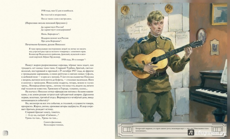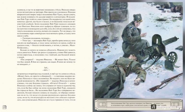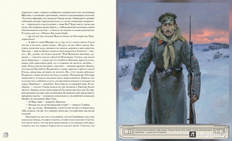 Именно герои романа - не повороты сюжета, не исторический фон - привлекли художника Андрея Николаева, одного из немногих, кто взялся за иллюстрирование "Белой гвардии". И он нарисовал не только красивых, гордых и обаятельных Турбиных или порядочного и умного Най-Турса, но и беспринципного Тальберга, трусливого и жадного Лисовича, очаровательного, но бесчестного Шполянского, жалкого безумца Русакова… Нарисовал людей, сущность которых проявляется именно в такие годы - военные, страшные и отчаянные. Людей, от дум, идей и дел которых когда-нибудь не останется на земле и тени. Но может остаться память.
