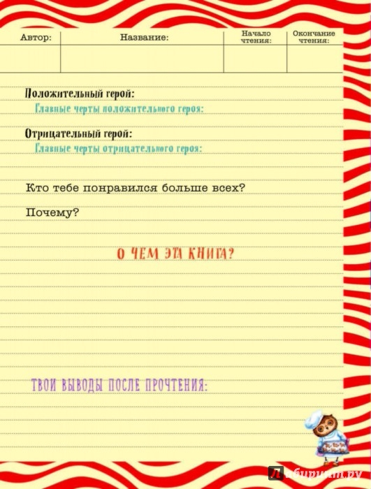 Дневник подскажет тебе, о чем нужно вспомнить после прочтения, а яркие веселые страницы помогут не превратить заполнение в скучное занятие!