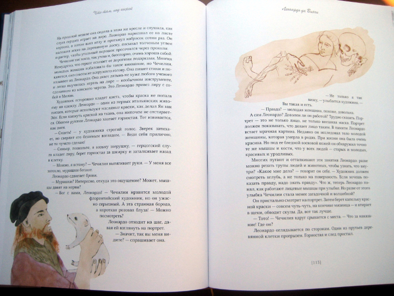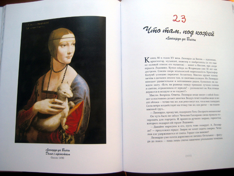 Здесь нет ничего, что напоминало бы скучные биографии. Например, рассказ о Леонардо да Винчи - это эпизод с позированием для портрета Чечилии Галлерани. Нам сообщается, что великий (но пока еще молодой) художник живет в Милане, при дворе герцога Лодовико.