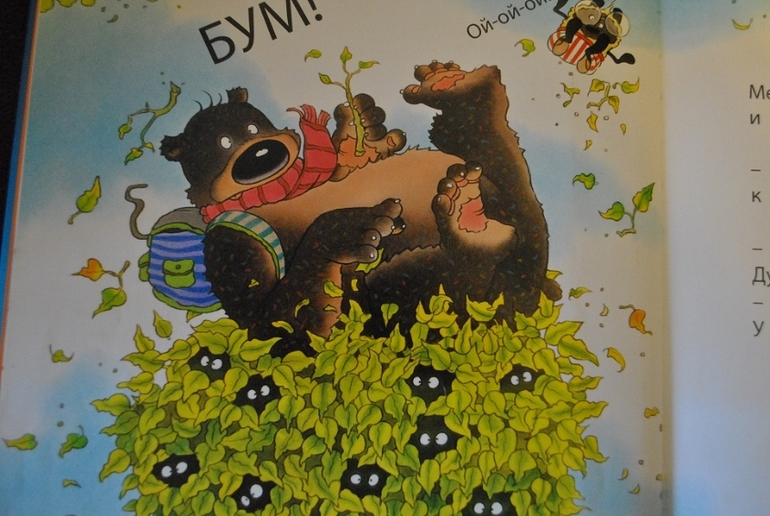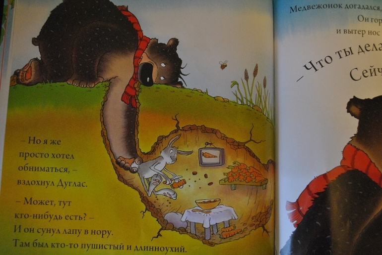 3. Две книги от издательства «Поляндрия» из серии про медвежонка Дугласа от автора и иллюстратора Дэвида Меллинга: «С кем обняться медвежонку?» и «Как медвежонок ходил в гости с ночевкой». Рекомендовала нам их взять библиотекарь, сказала, что это смешные книги и пользуются спросом у маленьких читателей. Хорошая серия книг для малышей: текст простой, яркие иллюстрации без лишней мешанины. Я бы назвала эту серию книг - комиксы для самых маленьких. Дочь слушала, иллюстрации рассматривала, но без фанатизма.