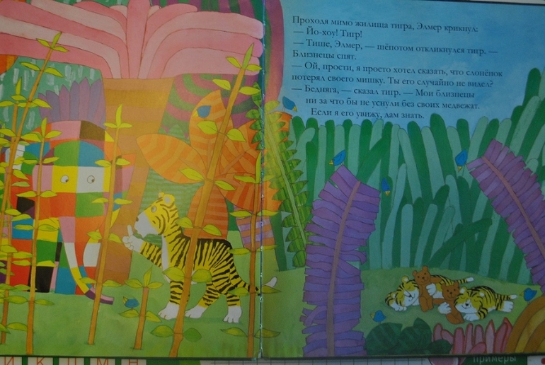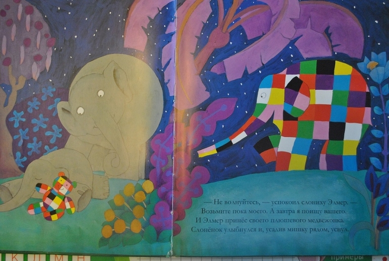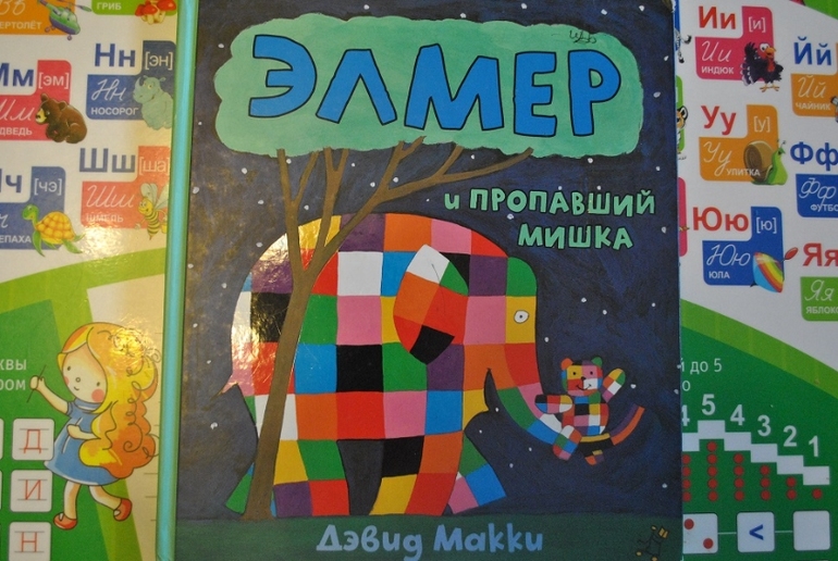 7. Дэвид Макки (автор и иллюстратор) «Элмер и пропавший мишка». Это одна из историй из серии книг про слоненка Элмера. У нас дома есть первая книга «Элмер», поэтому ребенок уже был знаком с этим «чудом природы» слоном в разноцветную клеточку. В этой книге маленький слоненок из стада Элмера потерял игрушечного медвежонка. Без мишки слоненку трудно заснуть. Элмер отправляется на поиски игрушки. Книга ничем не уступает своим предшественницам: иллюстрации яркие, текс простой и понятен малышам, наличие юмора.