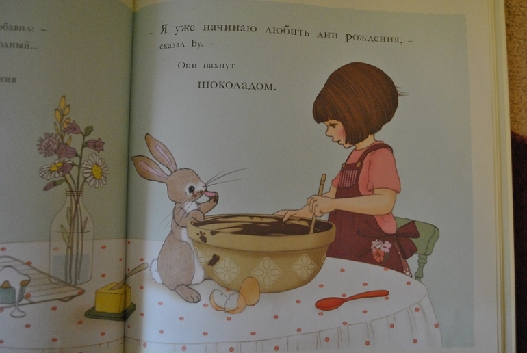 2. Следующая книга открыла для меня такое издательство как «Молодая мама». Книга из серии про «Белль и Бу» называется «Сюрприз», автор Джиллиан Шилдз, иллюстрации Мэнди Сателифф. Книга про двух друзей, девочки по имени Белль и кролика Бу. В этой книге Белль готовит праздник на День рождение для своего друга, и просит Бу ей в этом помочь. Тут тоже у иллюстраций пастельные тона. Скорее это книга для девочек, - все такое розово-бежевое и воздушное как зефирка. У нас книга не пошла, потому что любим мальчишеские книги, - самолеты, самосвалы, чтобы все прыгало и скакало. Но если у вас девочка-девочка, то серия книг про «Белль и Бу» ей будет интересна.