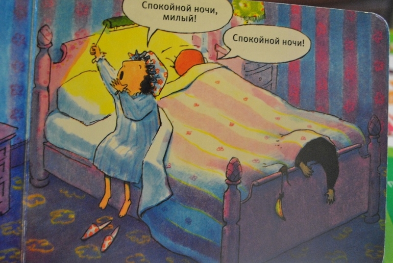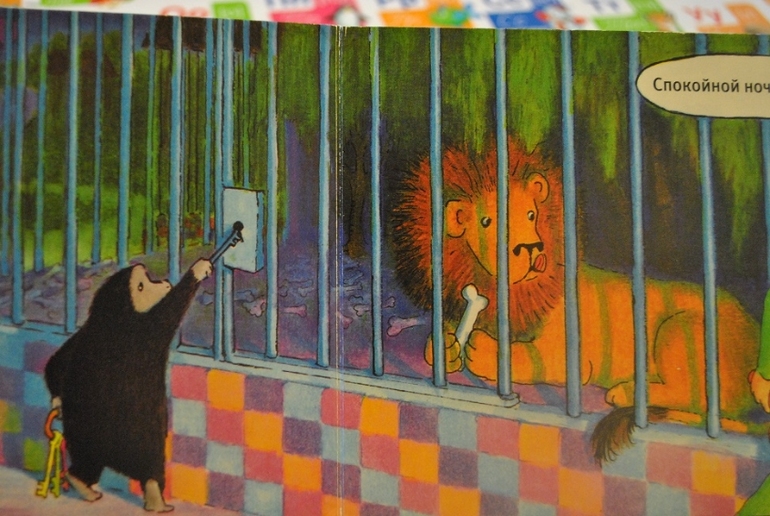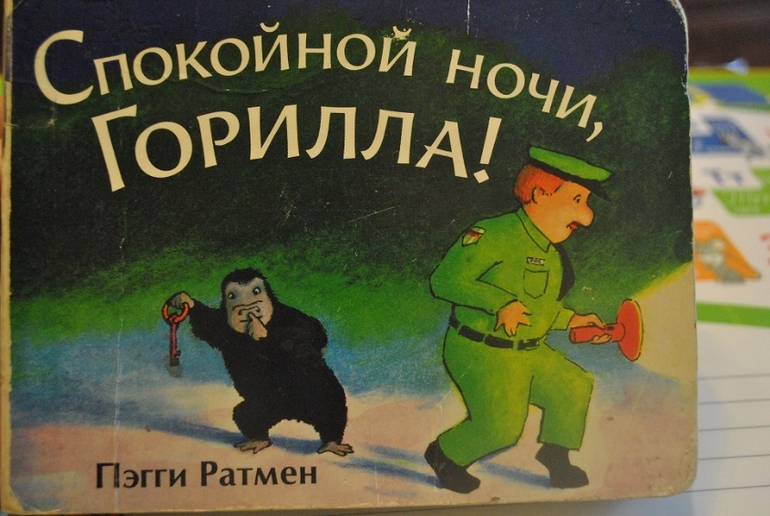 8. «Спокойной ночи, Горилла!», Пэгги Ратмен. Издательство «Розовый жираф». 2013 г. Тоже как-то быстро закончился тираж у этой книги. Служитель зоопарка перед сном делает обход и желает спокойной ночи всем животным. Ловкая горилла вытаскивает у него ключи и последовательно открывает все клетки. Из всего текста только: «Спокойной ночи!». Иллюстрации яркие. Книга юморная, вневозрастная, ее с удовольствием можно посмотреть и в год, и в пять, и в десять и т.д. Посмотрели, посмеялись над проказницей гориллой и вернем книгу в библиотеку. Бестселлером она у нас не стала.