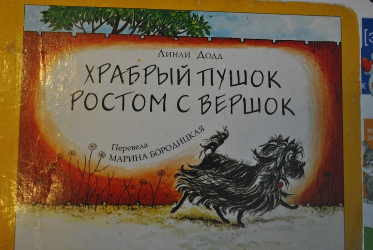 4. Следующую книгу в свое время показывали в сообществе ни один раз - это «Храбрый Пушок ростом с вершок» от автора и иллюстратора Линли Додд. Издательство «Розовый жираф». Перевод Марины Бородицкой. Пока я размышляла: «Брать - не брать?», тираж закончился. В итоге книга оказалась есть в наличии в нашей библиотеке. После прочтения осталось двоякое впечатление. Ребенку книга нравится, но только с того момента, когда появляется кот. Первую половину книги, где идет сбор собак, она просто терпит в ожидании этого кота.